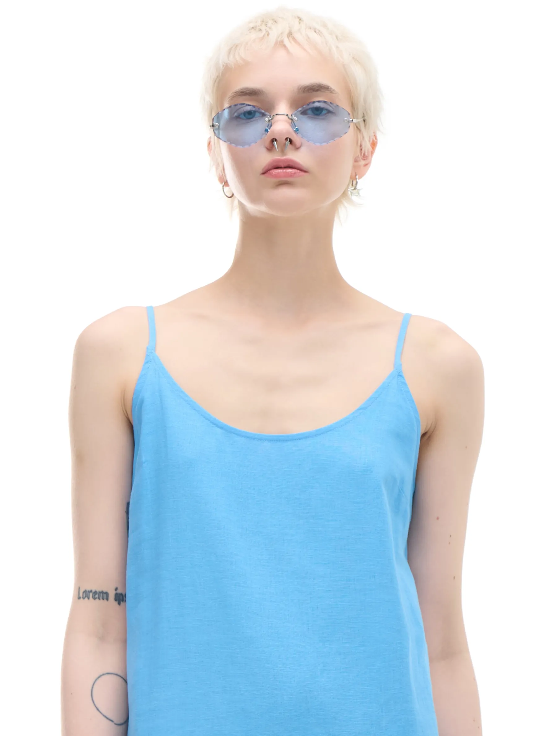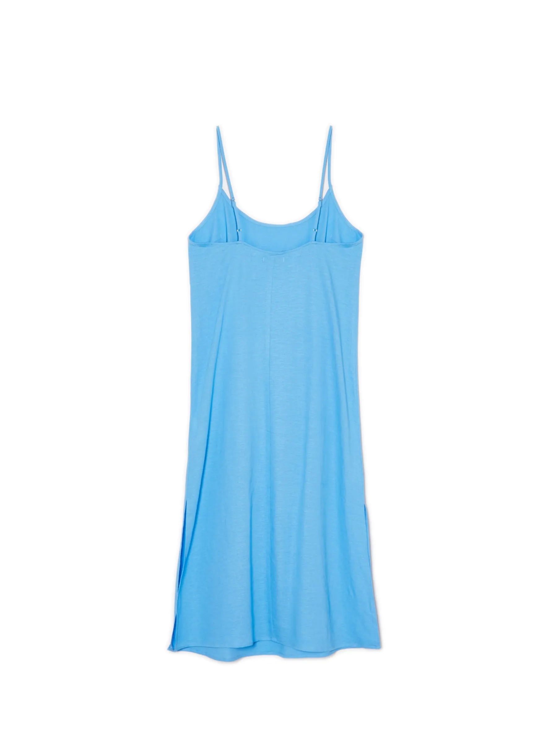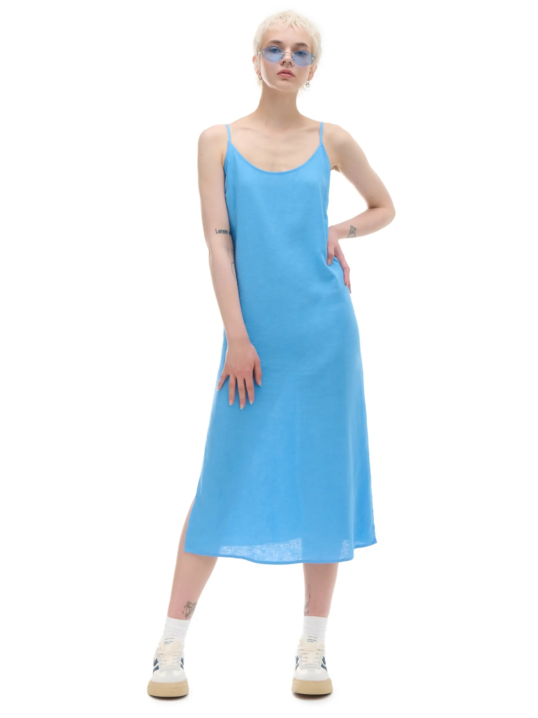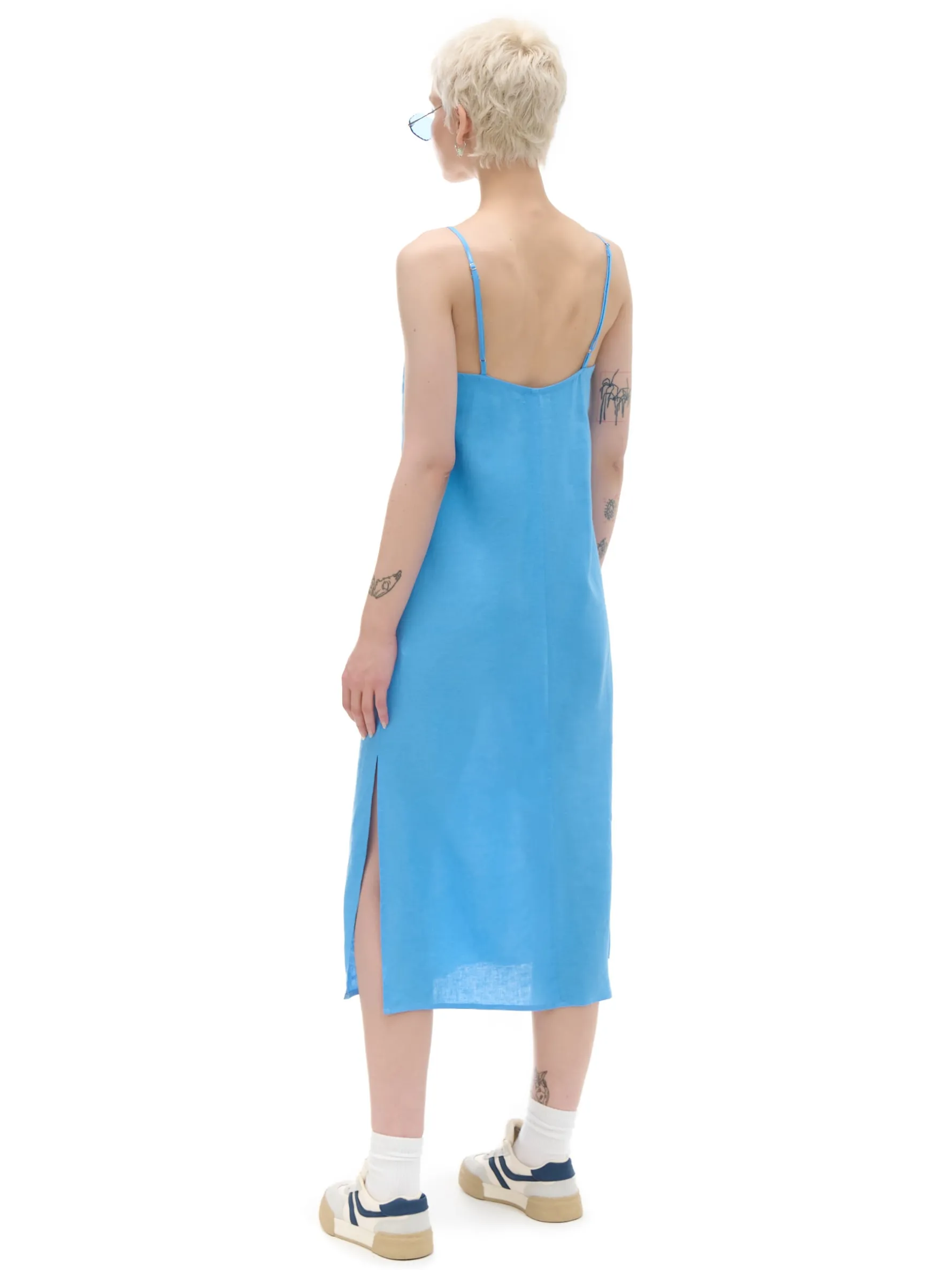 Zwiewna damska sukienka midi w niebieskim odcieniu uszyta z mieszanki wiskozy i lnu. Regulowane cienkie ramiączka, rozcięcia po bokach i luźny krój stawiają ją na topce letnich stylizacji. lekki materiał z wiskozą długość midi swobodny, luźny krój wąskie ramiączka z regulacją długości delikatne rozcięcia po bokach