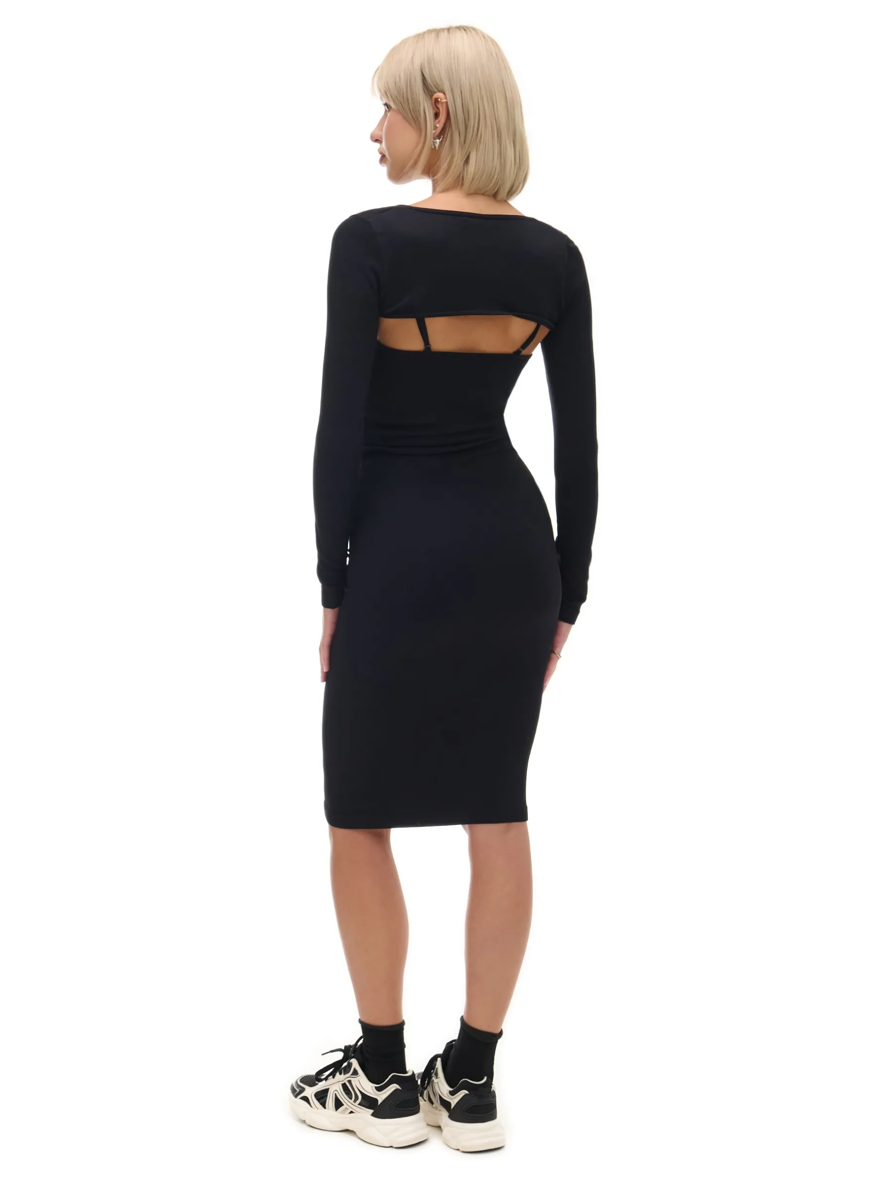 Czarna sukienka damska o długości maxi, uszyta mieszanki materiałów o gładkiej teksturze. Ten model po założeniu tworzy efektowne wycięcia na przodzie i plecach. materiał z dodatkiem elastycznych włókien długość midi i dopasowany krój głęboki dekolt wąskie ramiączka z regulacją długości długie, dopasowane rękawy rozcięcie z boku Wzrost modelki: 177 cm