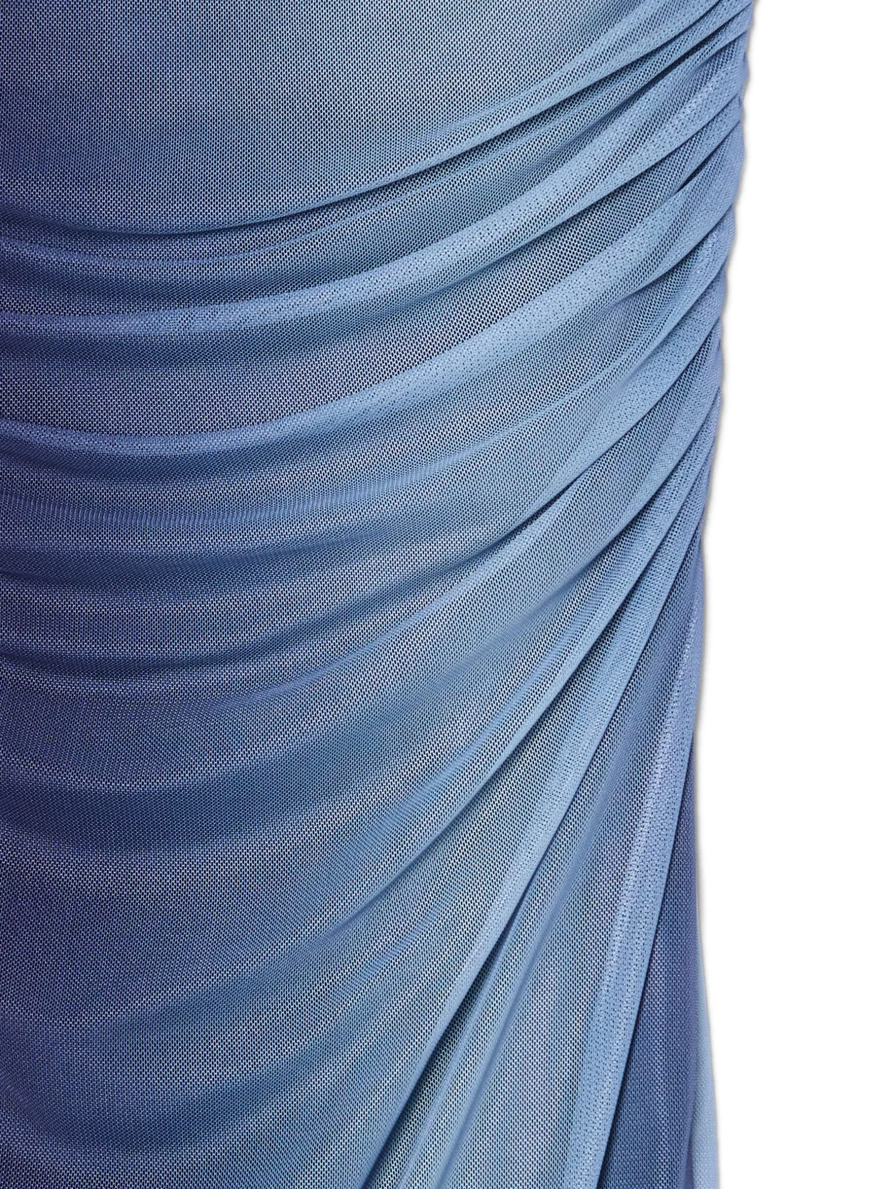 Dopasowana sukienka uszyta z lekkiego materiału w niebieskim odcieniu z dodatkiem elastycznych włókien. Symetryczne marszczenia i ten artystyczny print wyróżnią Cię w tłumie! dzianina z domieszką elastycznych włókien dopasowany krój podkreślający sylwetkę bez rękawów dekoracyjne marszczenie pod biustem wewnątrz wykończenie na podszewce nadruk all over