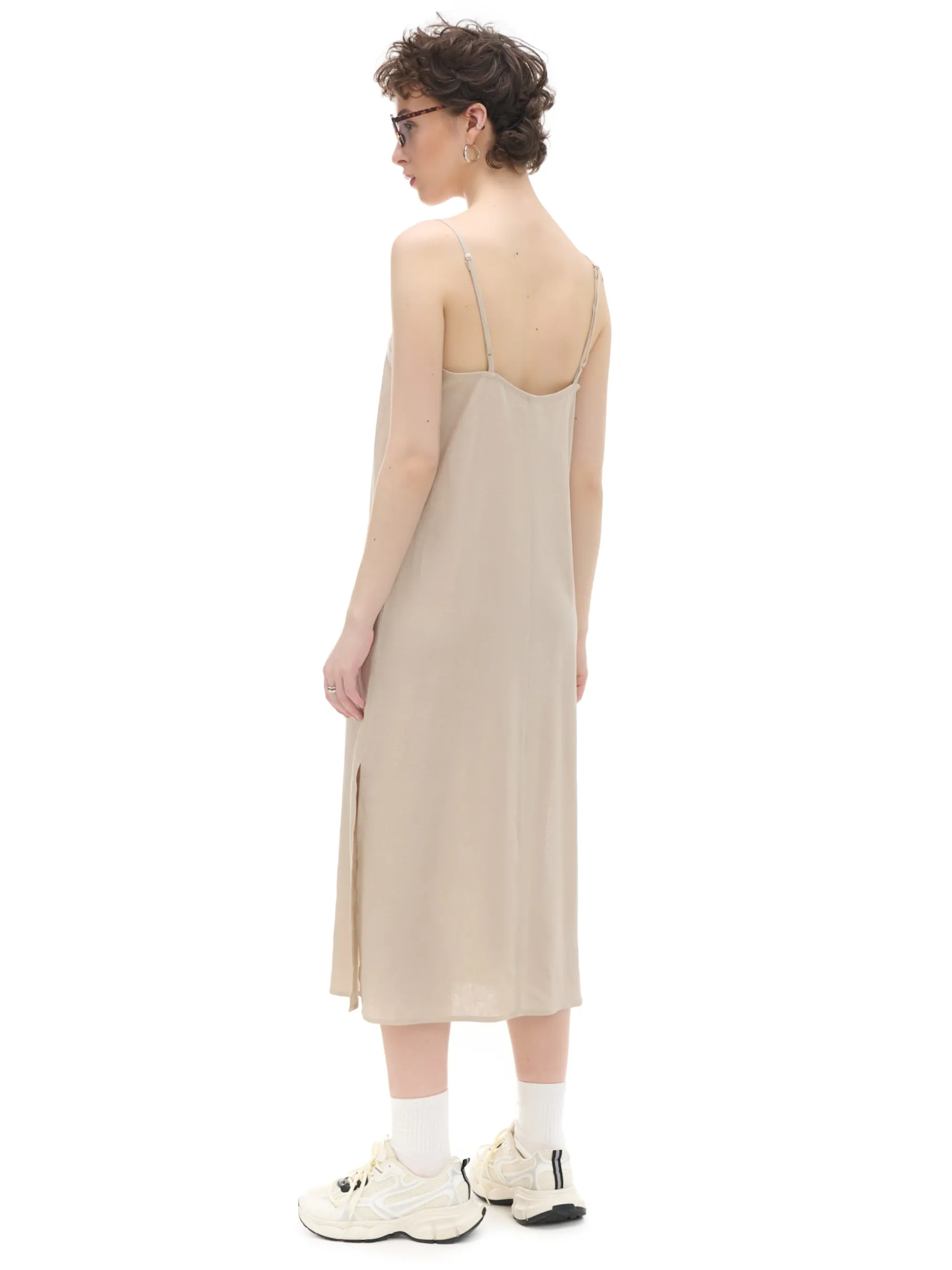 Zwiewna damska sukienka midi w kremowym odcieniu uszyta z mieszanki wiskozy i lnu. Regulowane cienkie ramiączka, rozcięcia po bokach i luźny krój stawiają ją na topce letnich stylizacji. lekki materiał z wiskozą długość midi swobodny, luźny krój wąskie ramiączka z regulacją długości delikatne rozcięcia po bokach Wzrost modelki: 176 cm