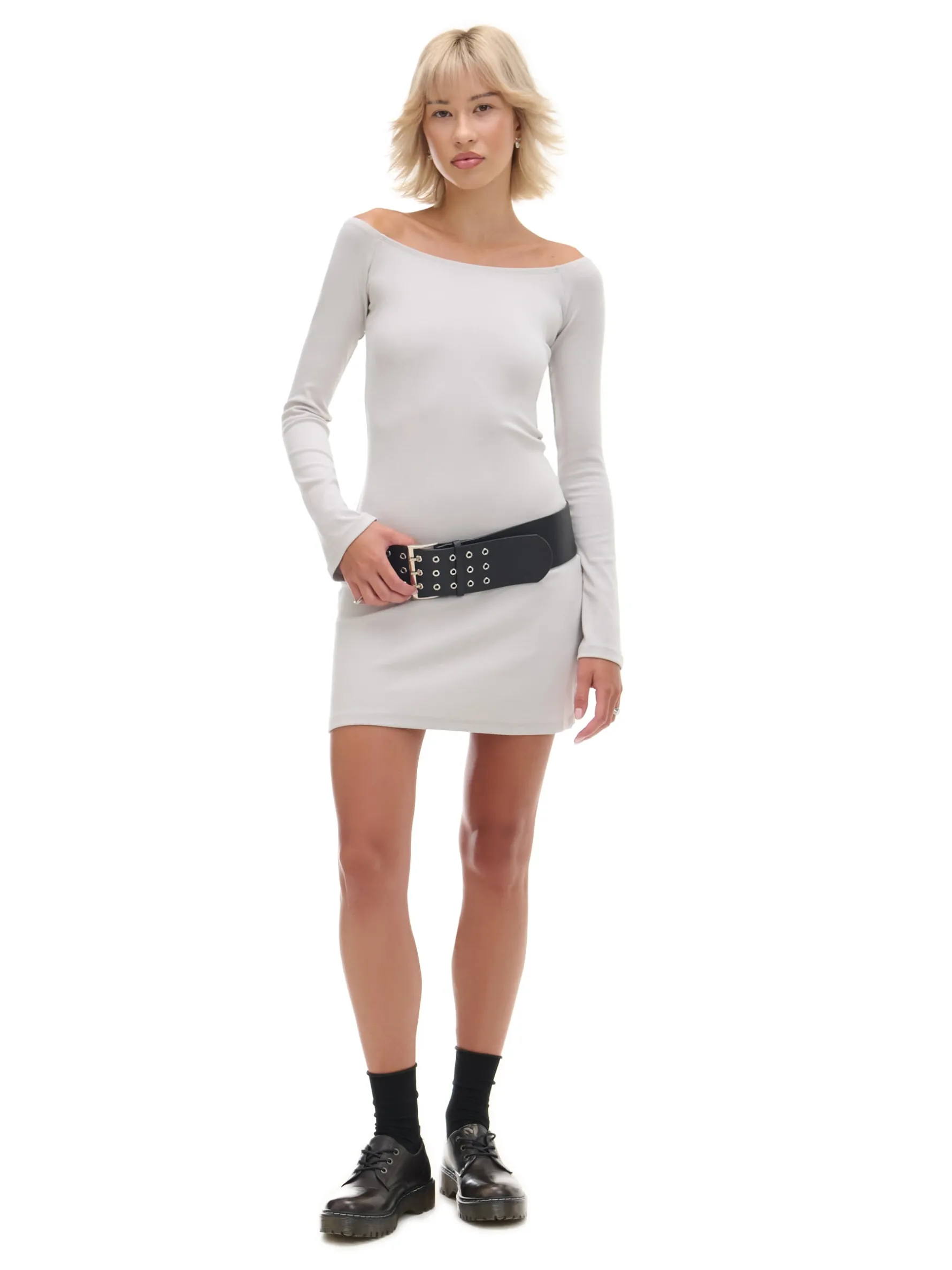 Damska sukienka o długości mini, uszyta z dzianinowego materiału z bawełną. Ozdobą są długie rękawy rozszerzane ku dołowi, nadające lekkości całej stylizacji. bawełna z dodatkiem elastycznych włókien delikatne taliowanie dekolt w łódkę wykończony gumką lekko rozszerzane rękawy opadające ramiona Wzrost modelki: 177 cm