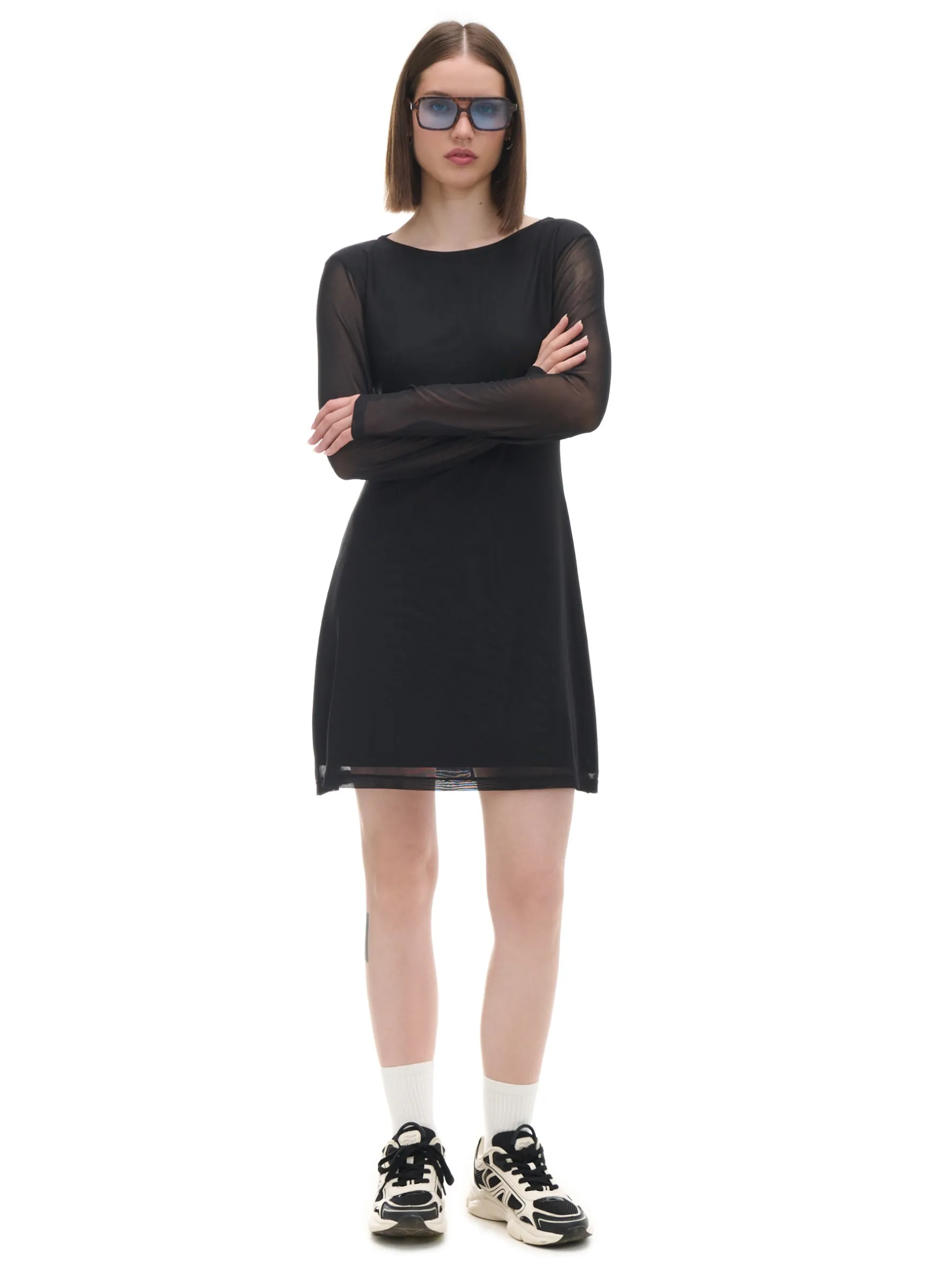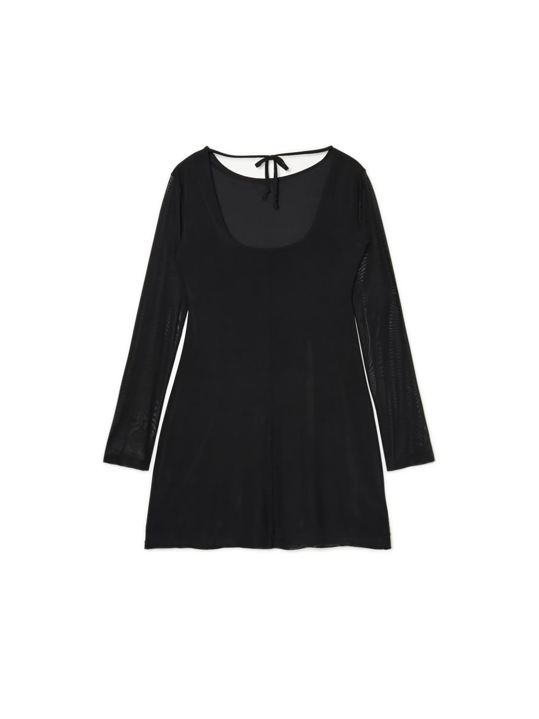 Damska sukienka o długości mini uszyta z lekkiego materiału. Wyposażona w głęboki dekolt na plecach, dekoracyjne wiązanie i ozdobne panele z siateczki mesh. Genialna na randki i nie tylko! krótka, czarna sukienka o swobodnym kroju długość mini, rozszerzany dół wewnątrz gładka podszewka lekko rozszerzane rękawy kwadratowy dekolt z tyłu ozdobne wiązanie na plecach ozdobne panele z siateczką typu mesh modelujące zakładki z przodu