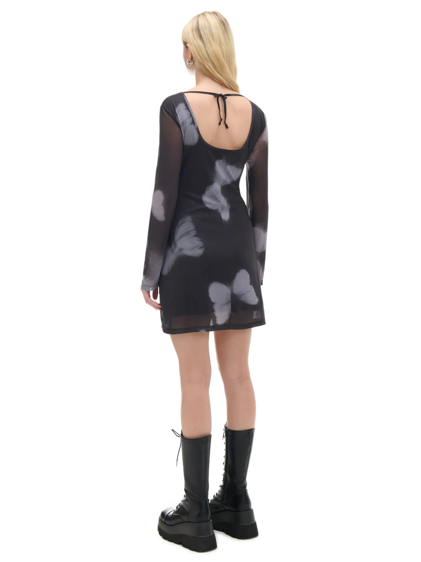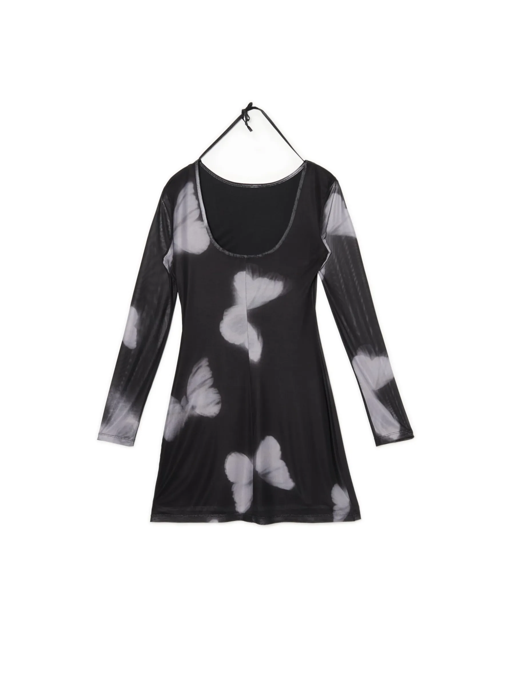 Damska sukienka o długości mini uszyta z lekkiego materiału ze wzorem w motyle. Wyposażona w głęboki dekolt na plecach, dekoracyjne wiązanie i ozdobne panele z siateczki mesh. Genialna na randki i nie tylko! krótka, czarna sukienka o swobodnym kroju długość mini, rozszerzany dół wewnątrz gładka podszewka lekko rozszerzane rękawy kwadratowy dekolt z tyłu ozdobne wiązanie na plecach ozdobne panele z siateczką typu mesh modelujące zakładki z przodu zwierzęcy print all over