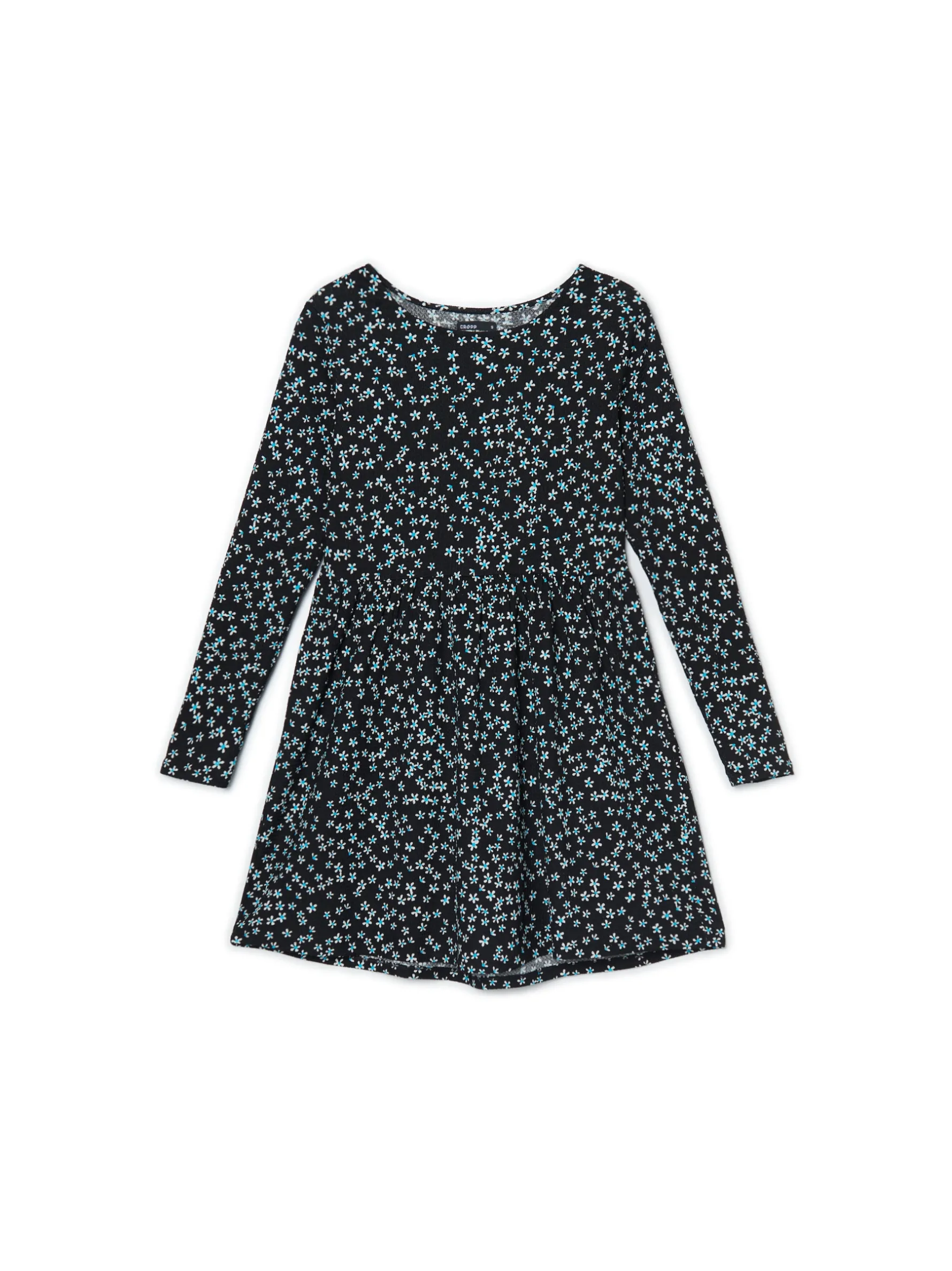 Krótka sukienka damska o lekko rozszerzanym kroju. uszyta z dzianiny zawierającej dodatek elastycznych włókien zabudowany dekolt odcięcie w pasie, wzór w kwiaty all over dostępna w innej wersji kolorystycznej