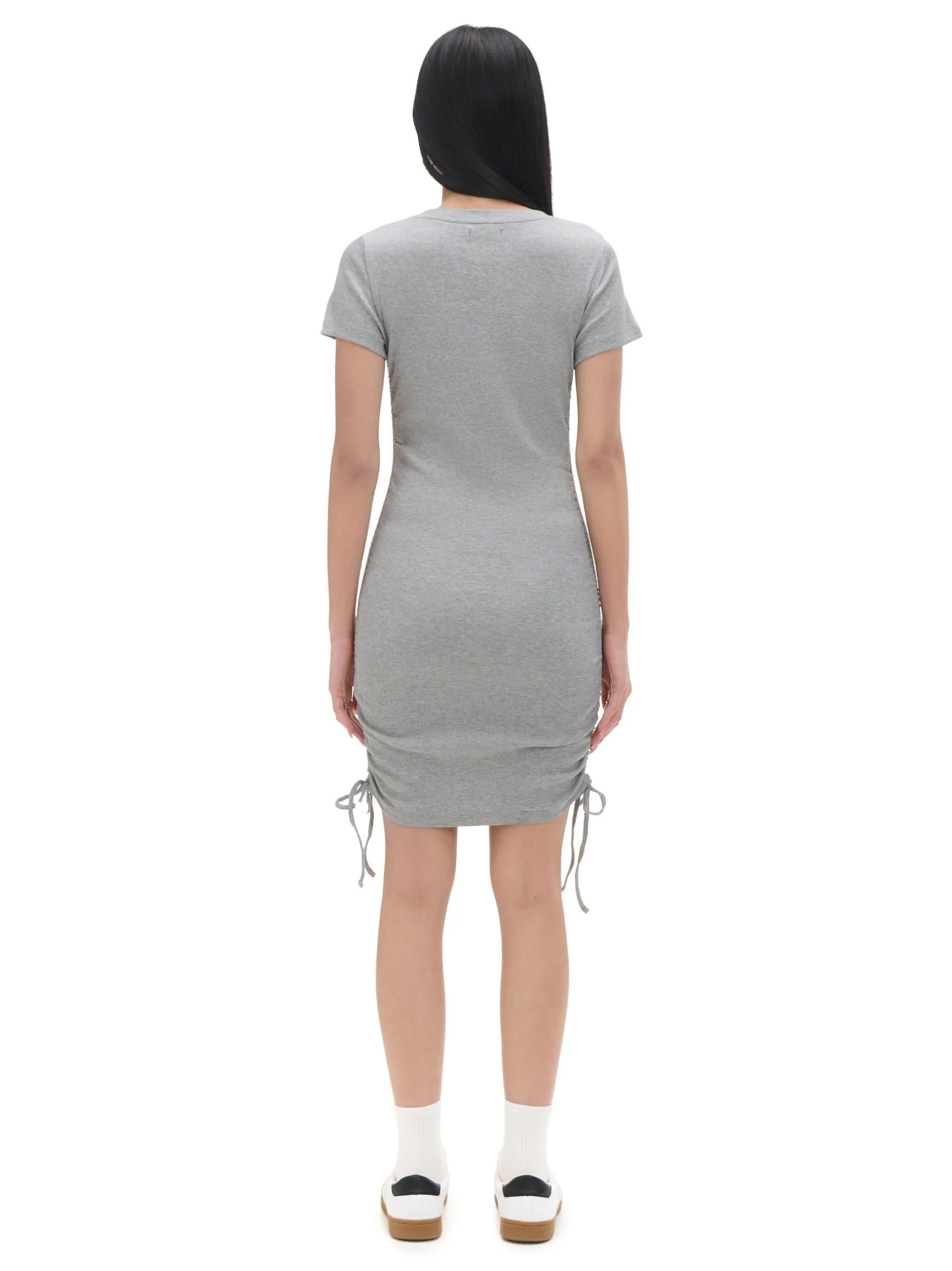 Sukienka damska o dopasowanym kroju, uszyta z bawełny z dodatkiem elastanu. Krótkie rękawy, po bokach ozdobne marszczenia i wiązanie. Rozmiar ubrania: S Wzrost modelki: 168 cm