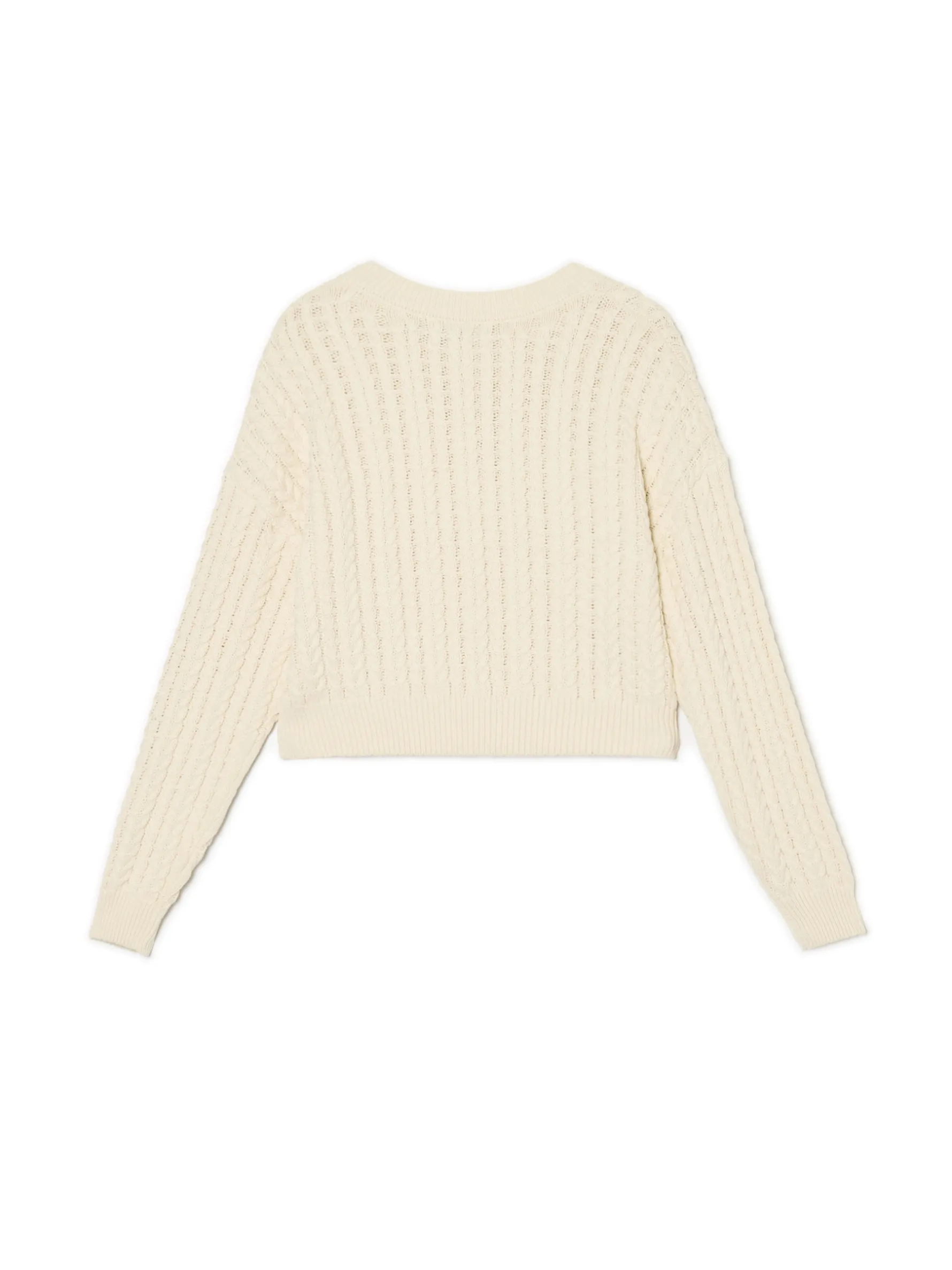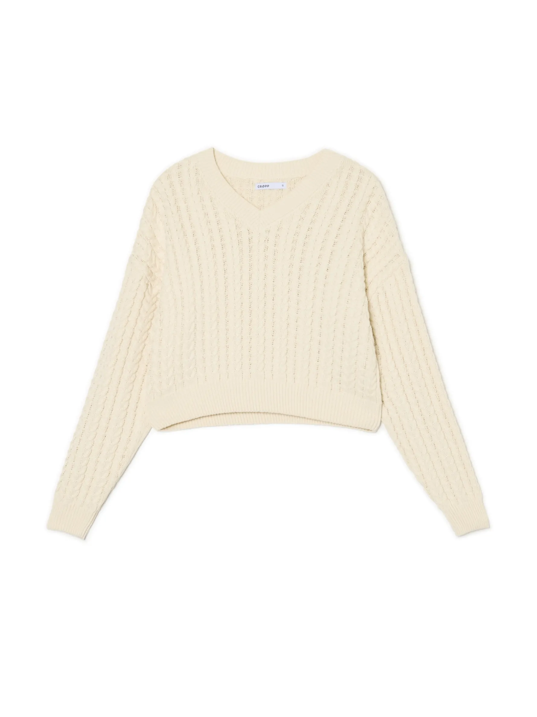 Basicowy damski sweter uszyty z bawełnianej dzianiny w jasnym odcieniu. Ozdobą są dekoracyjny warkoczowy splot i dekolt w serek. Idealny retro model na jesienno-zimowe spacery lub pogaduchy z Bestie przy herbacie.