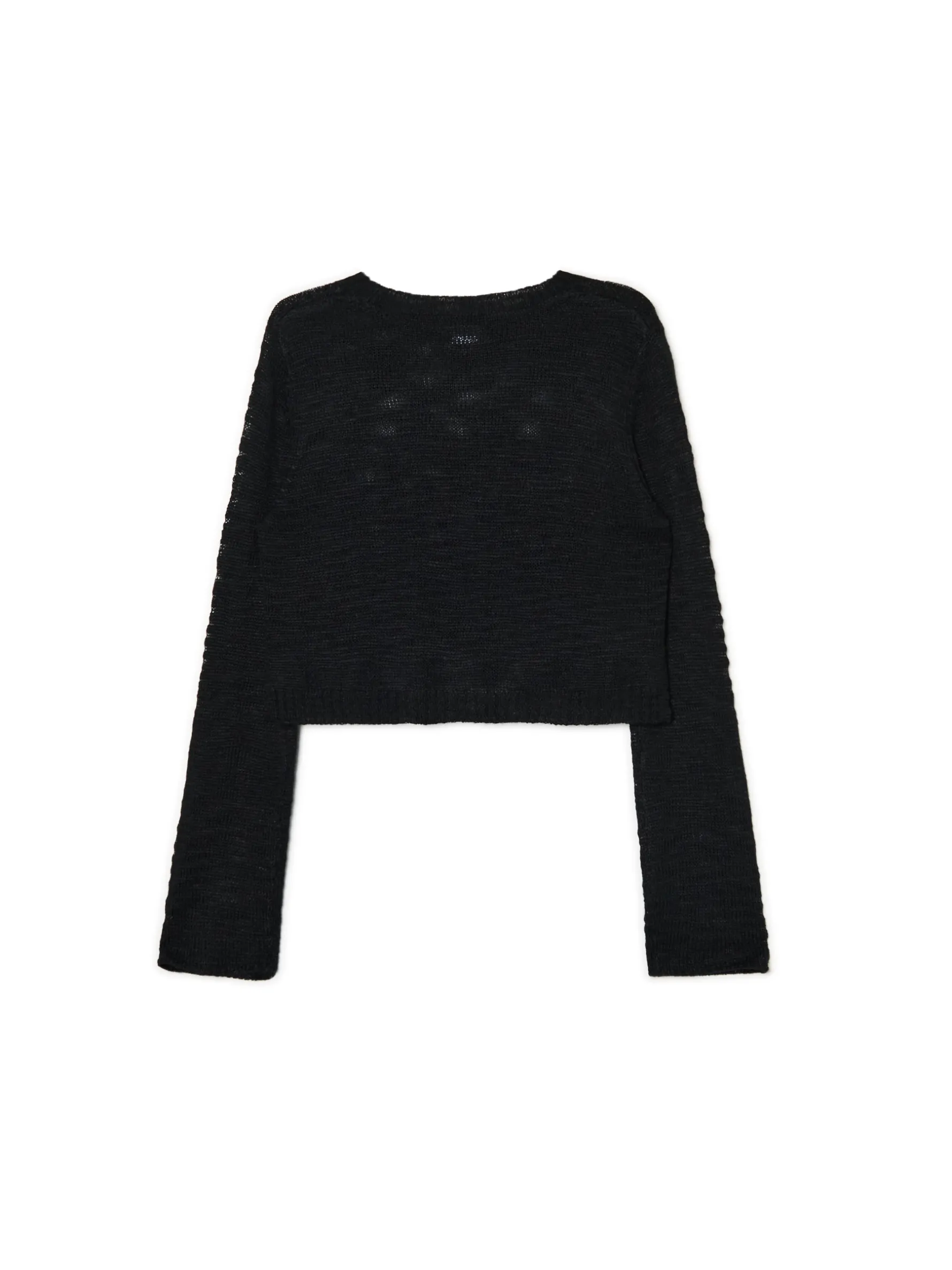 Damski sweter o krószym kroju z długimi rękawami, uszyty z prześwitującego materiału. Fituje z różnego typu koszulkami na ramiączkach i topami. wyjątkowo mocny, a jednocześnie wygodny materiał regularny krój półokrągły dekolt z lamówką długie, swobodne rękawy dekoracyjne rozcięcia po bokach