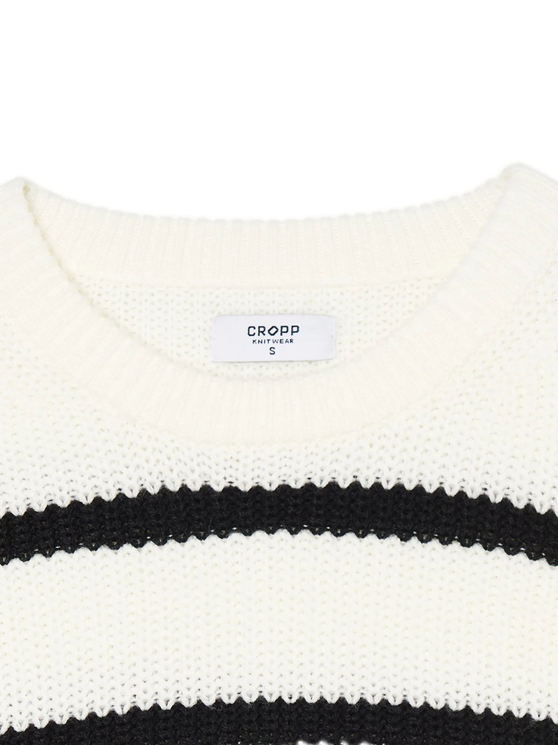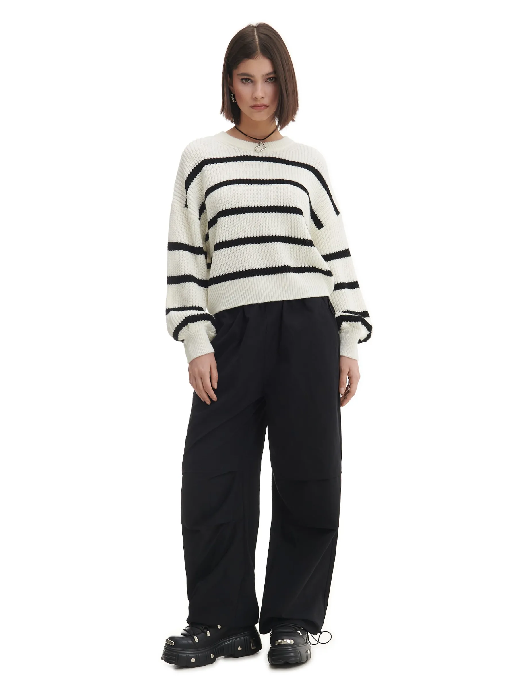 Kremowo-czarny sweter damski o regularnym kroju, uszyty z dzianiny. Szerokie rękawy z ozdobnym wykończeniem. Dostępne inne warianty kolorystyczne.