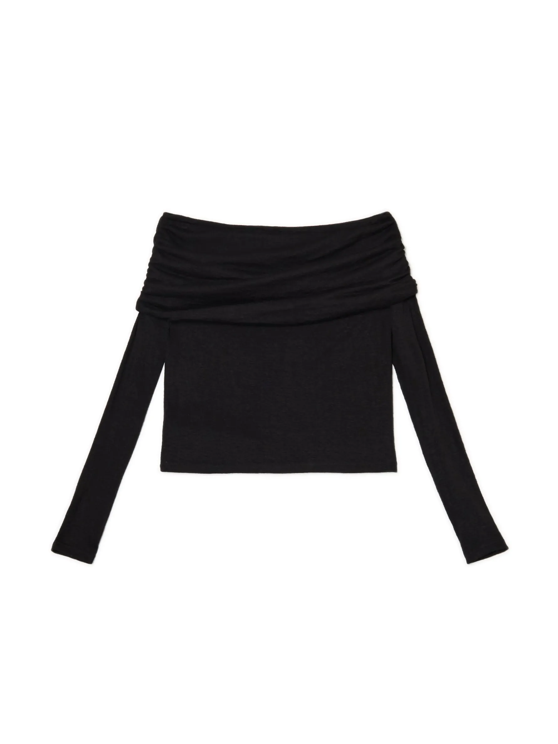 Czarny sweter damski o dopasowanym kroju, uszyty z delikatnej dzianiny. Ten model wyróżnia obszerny golf z dekoracyjnym marszczeniem, eksponujący ramiona. dopasowany krój podkreślający sylwetkę dekolt w łódkę opadające ramiona długie, dopasowane rękawy ozdobne marszczenia