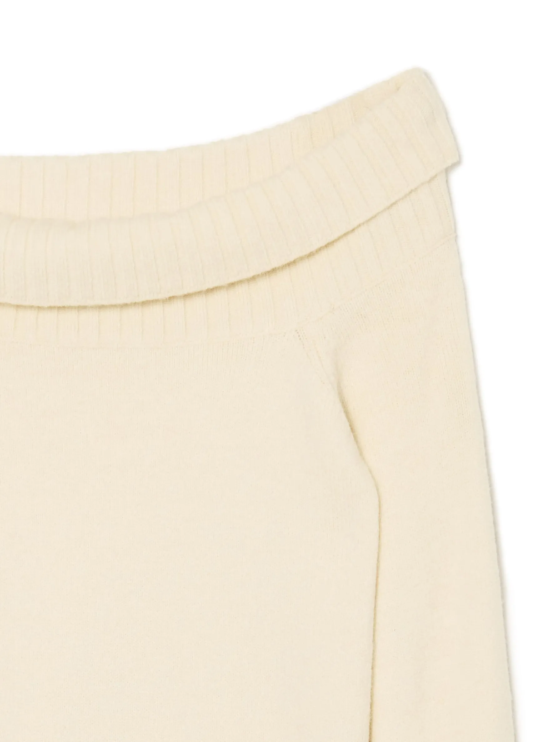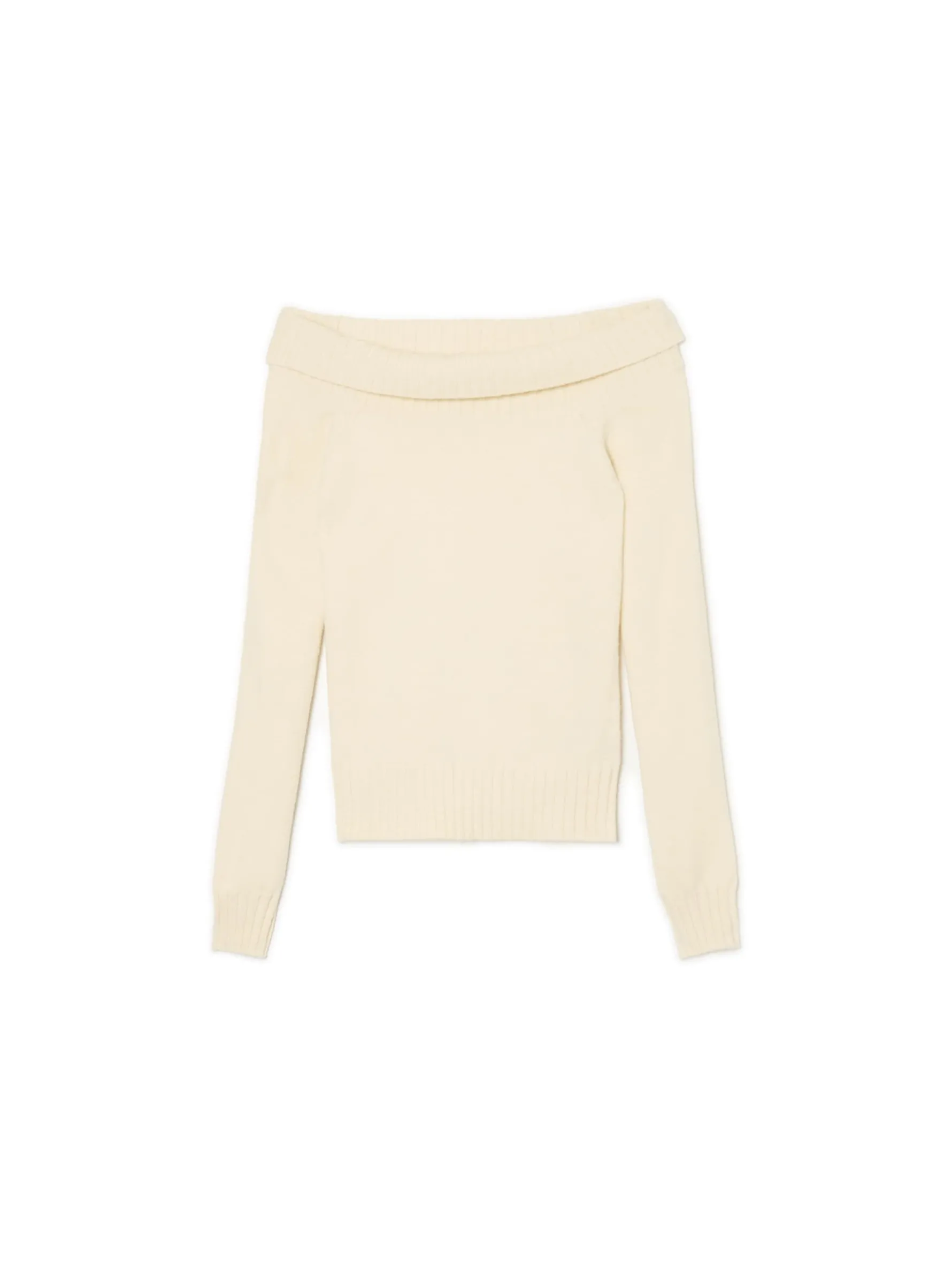 Damski sweter o regularnym kroju uszyty z mieszanki dzianin w gładkim, stonowanym kolorze. Dopasowany krój pięknie podkreśla sylwetkę, a odkryte ramiona zwracają na siebie uwagę. Idealny casual na wyjątkowe okazje! uszyty z gładkiej dzianiny regularny krój dekolt typu carmen opadające ramiona dół i rękawy wykończone prążkowanym ściągaczem