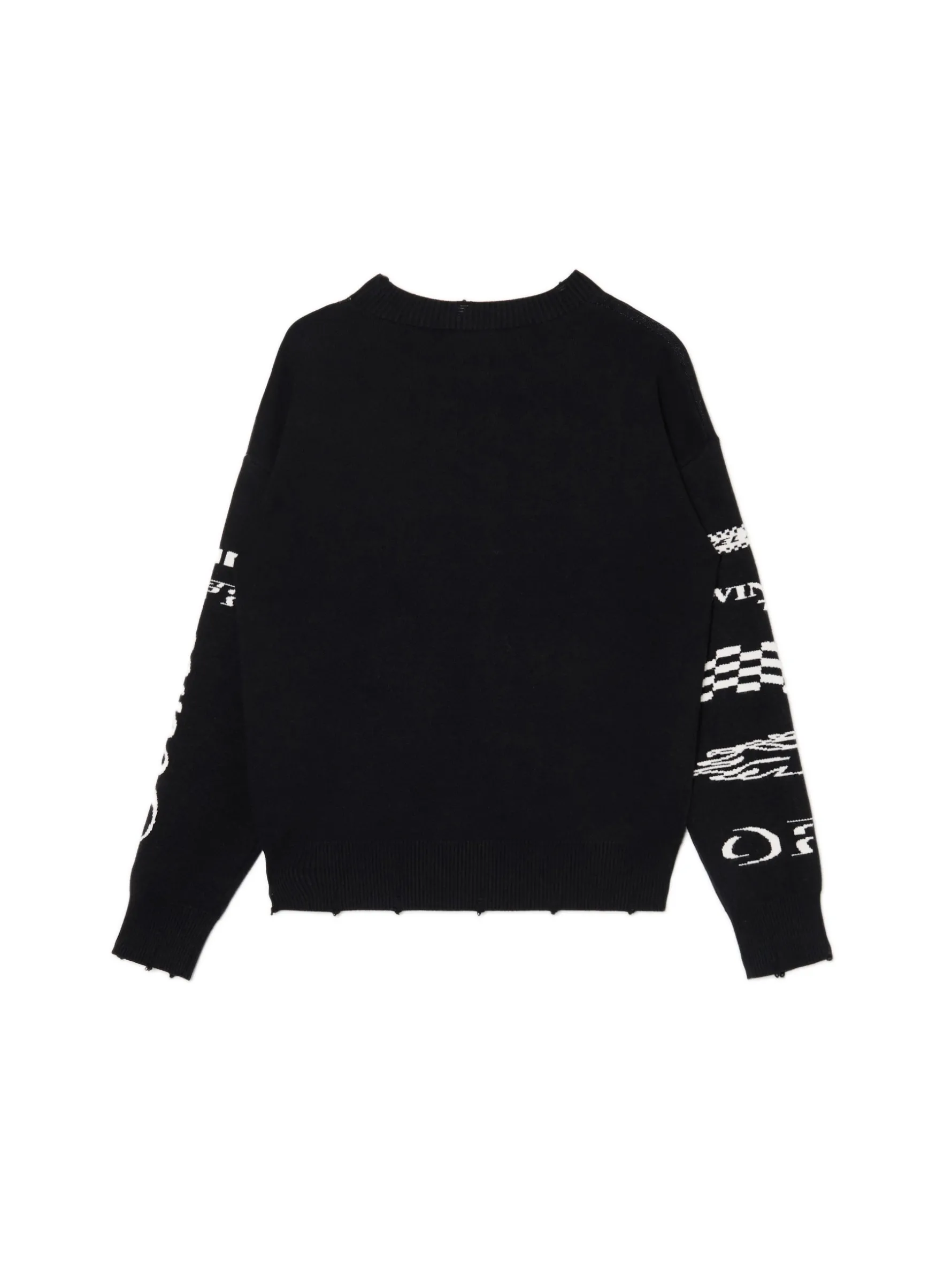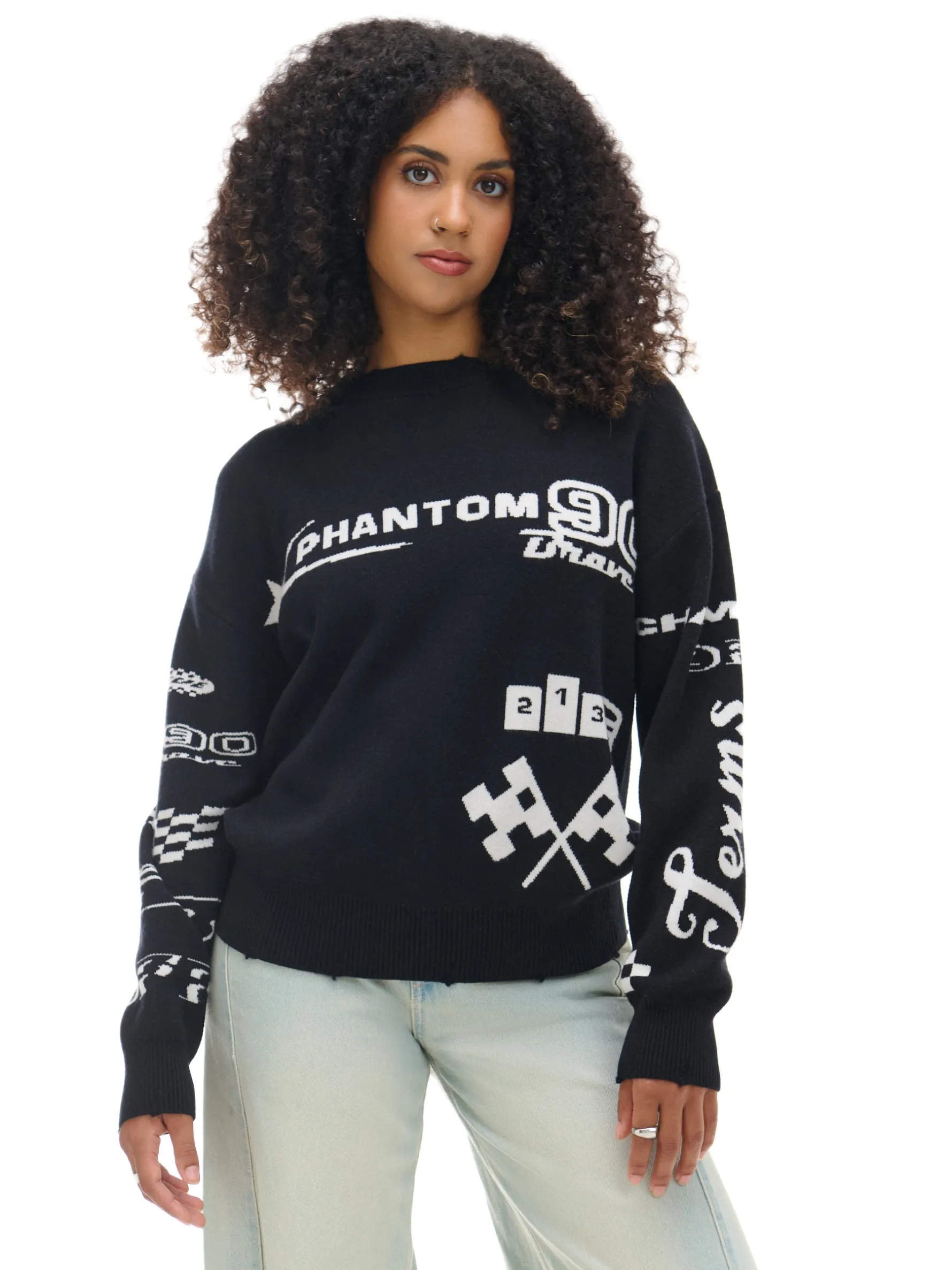 Czarny damski sweter wykonany z mieszanki dzianin z dodatkiem wiskozy. Prążkowane ściagacze na rękawach i w pasie zapobiegają unoszeniu się materiału. Na całej powierzchni unikatowy nadruk z motywem wyścigu. uszyty z mieszanki dzianin zawierającej wiskozę regularny krój okrągły dekolt wykończony lekkim ściągaczem mankiety rękawów z prążkowanej dzianiny dół wykończony delikatnym, prążkowanym ściągaczem kontrastowe nadruki z przodu i na rękawie