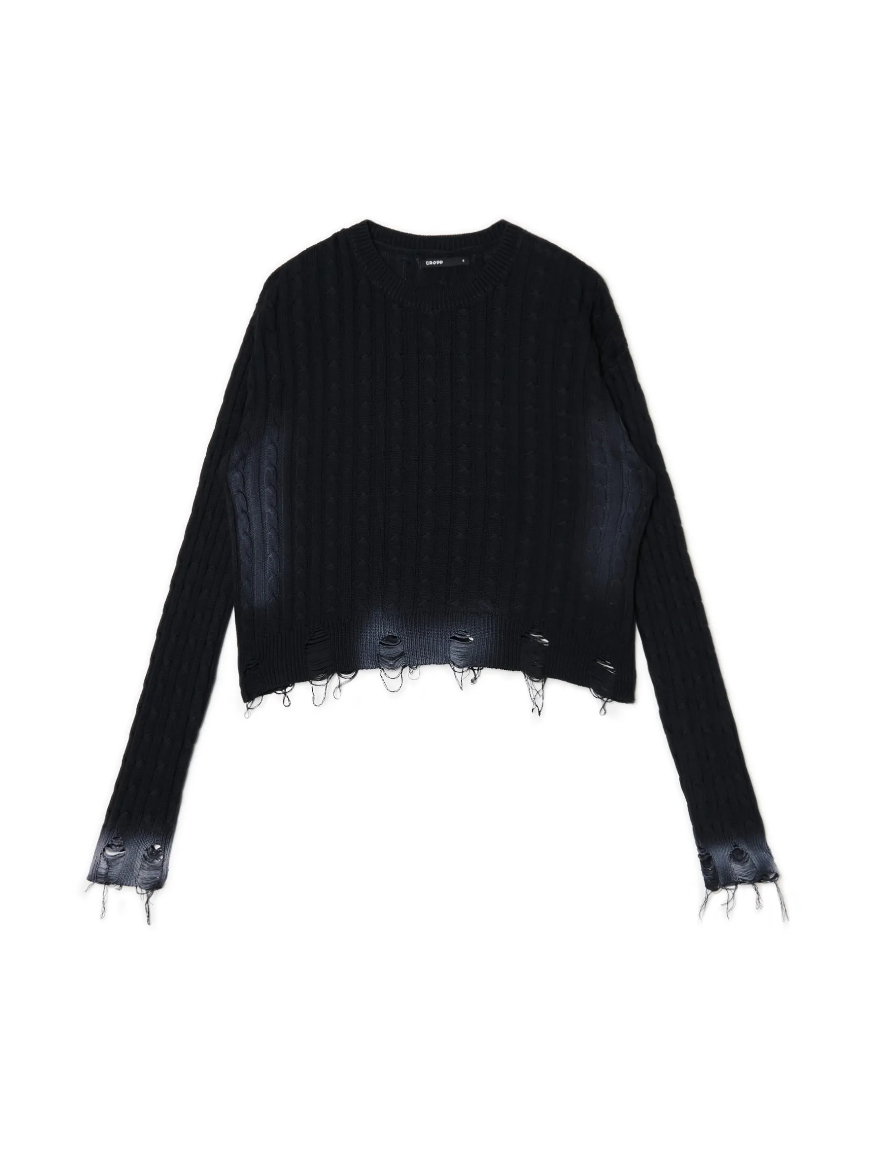 Czarny sweter damski uszyty z solidnej, plecionej dzianiny z efektem wybielenia na całości. Surowe wykończenie brzegów, przetarcia i postrzępienia nadają mu streetowego charakteru. Genialny dodatek do jesiennych stylizacji. 100% bawełny regularny krój długie, dopasowane rękawy okrągły dekolt z lamówką dół i rękawy wykończone prążkowanym ściągaczem efekt wybielenia na całości ozdobne postrzępienia surowe wykończenie brzegów Gramatura: 350 gsm