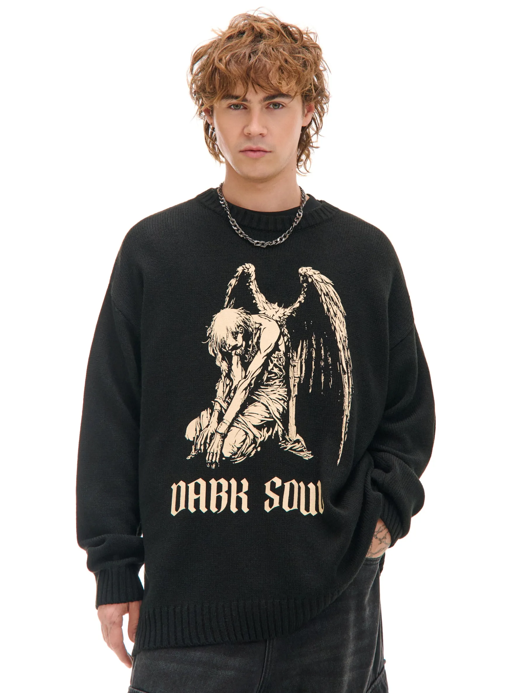 W zimę warto wyposażyć się w kilka swetrów. Ten męski żakardowy model uszyty z miękkiej w dotyku dzianiny zapewni Ci komfort i ciepło. Na przodzie oryginalny nadruk w kontrastowym odcieniu. krój oversize okrągły dekolt z lamówką długie, proste rękawy duży nadruk z przodu