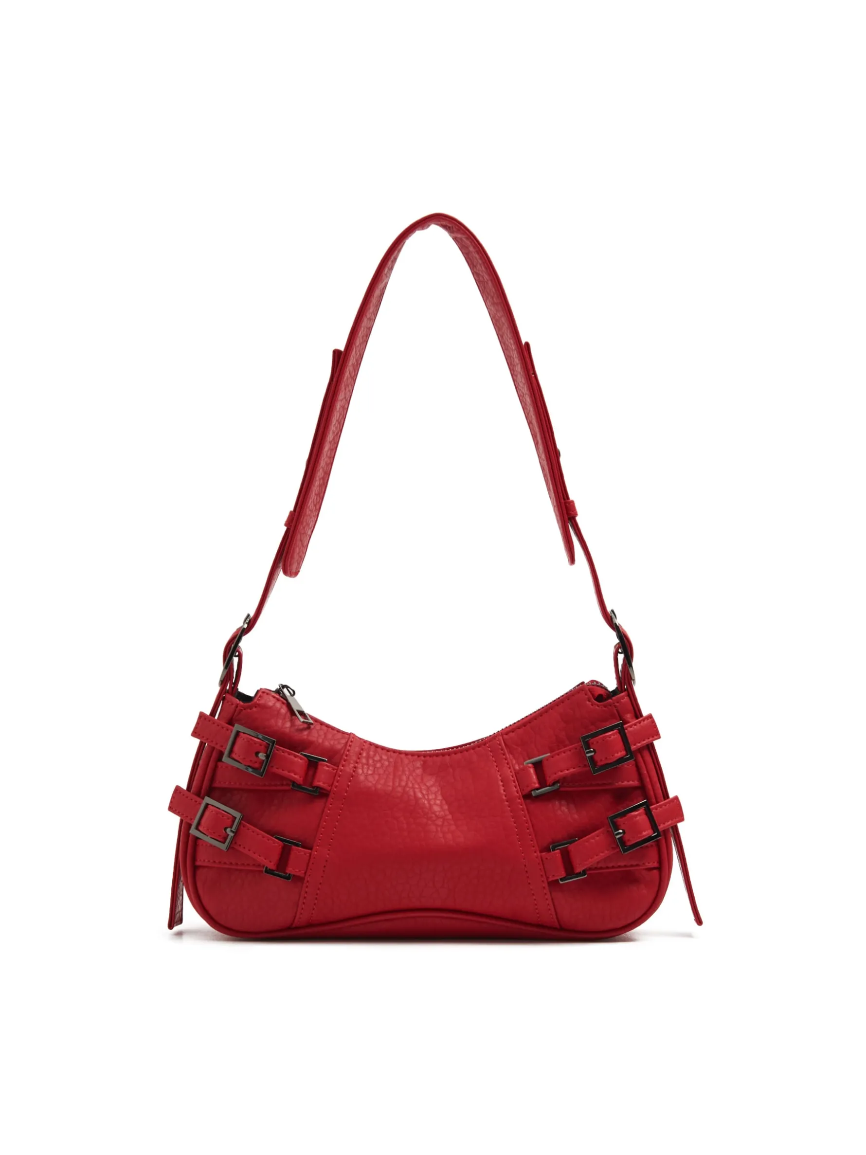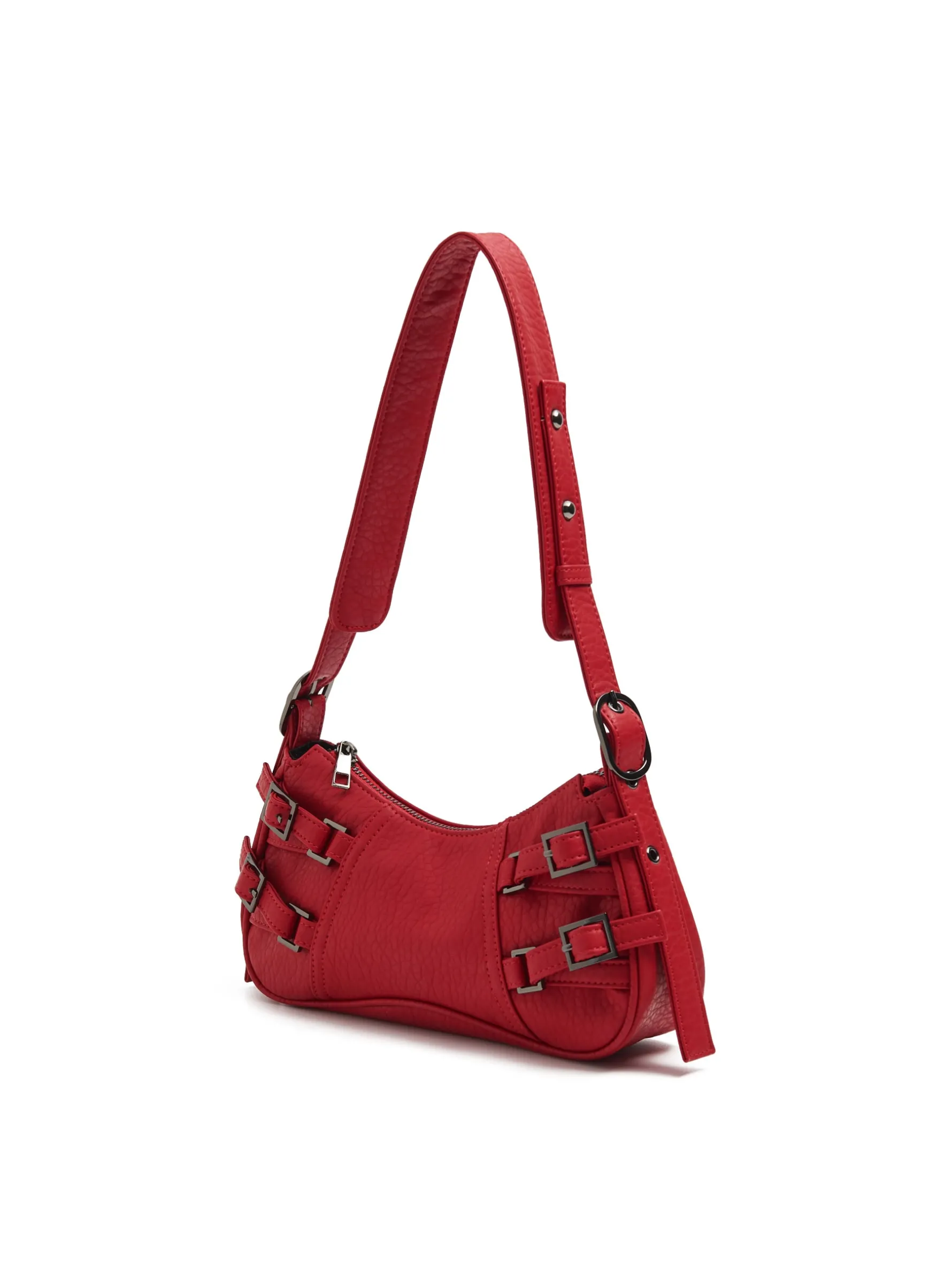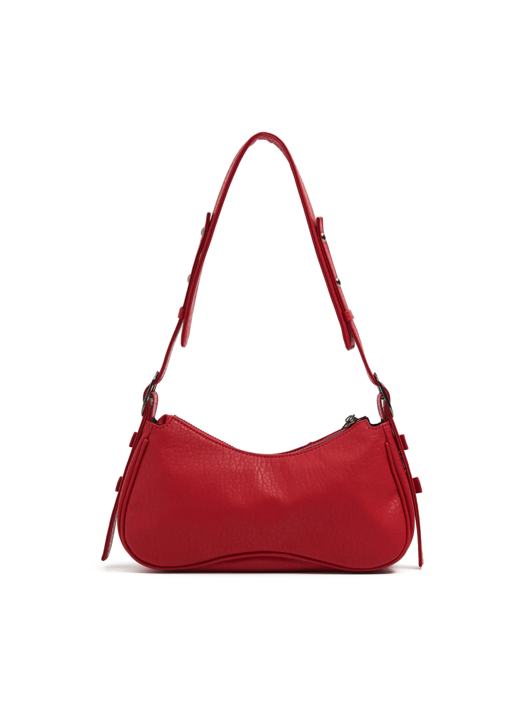 Mała damska torebka uszyta z materiału imitującego skórę w kolorze czerwonym. Dobierz do niej swoje ulubione dodatki! wykonana z imitacji skóry zapinana na zamek na całej długości wewnątrz kieszeń z zamkiem pasek z regulacją długości ozdobne paski z klamrami