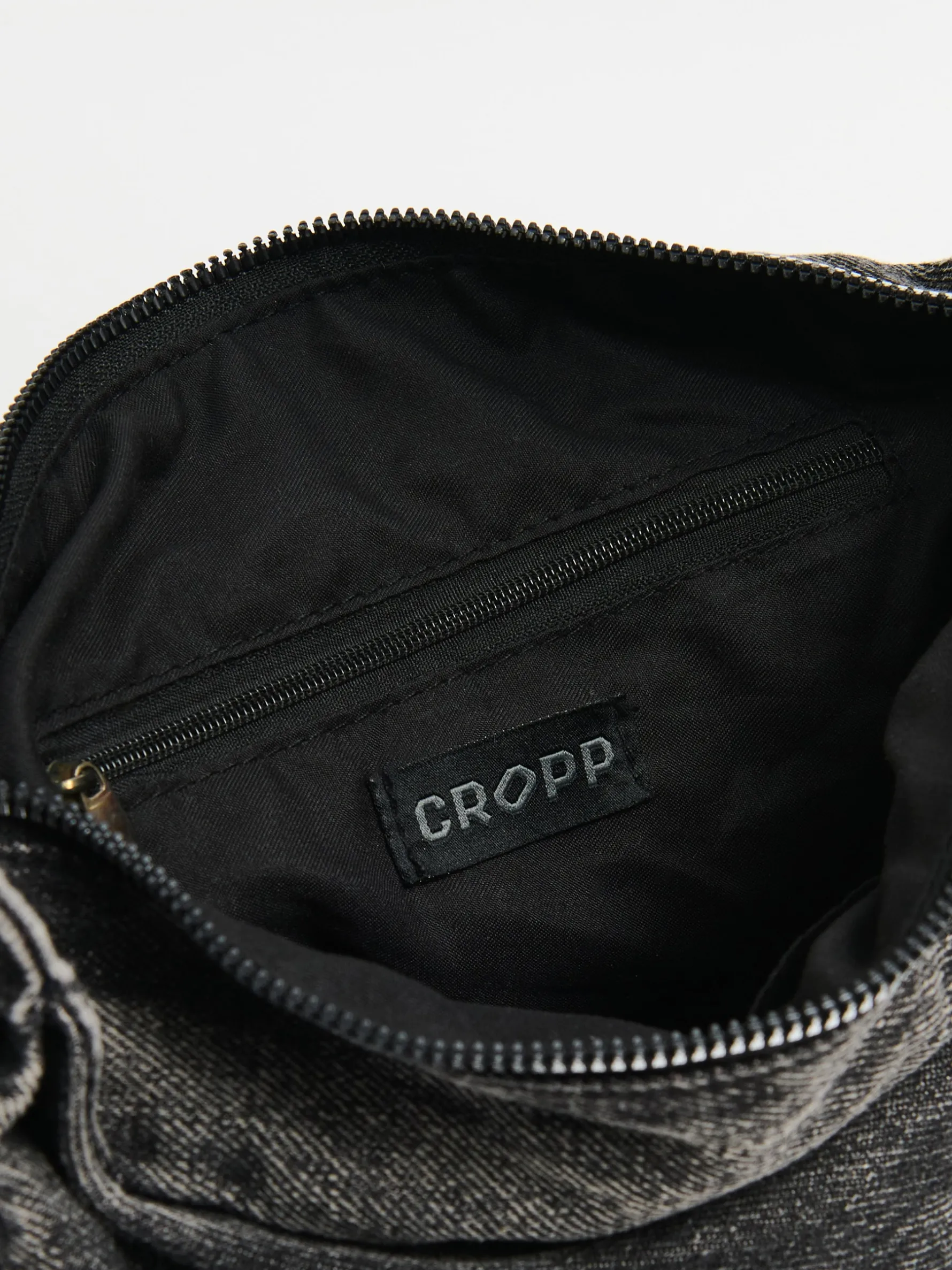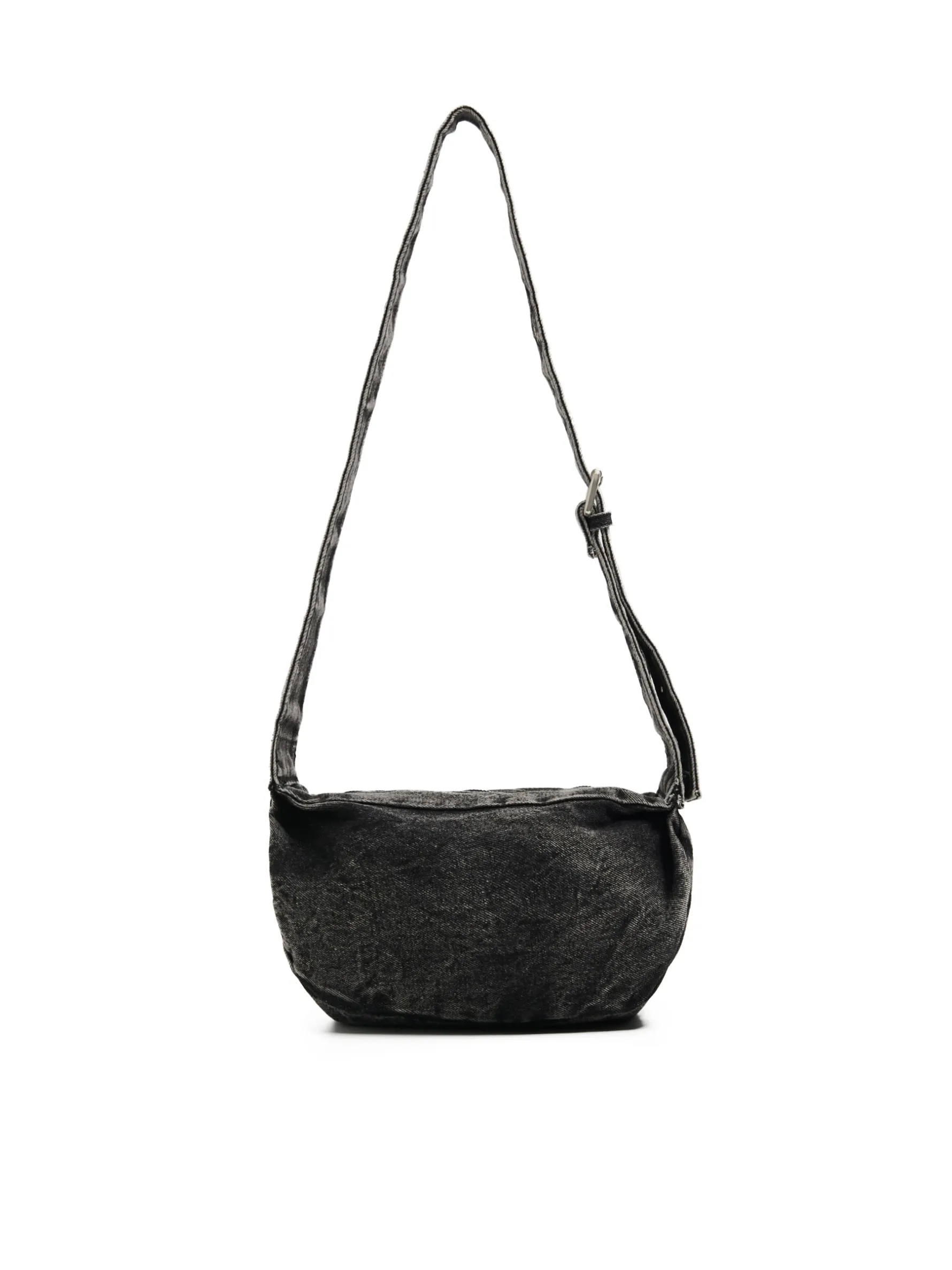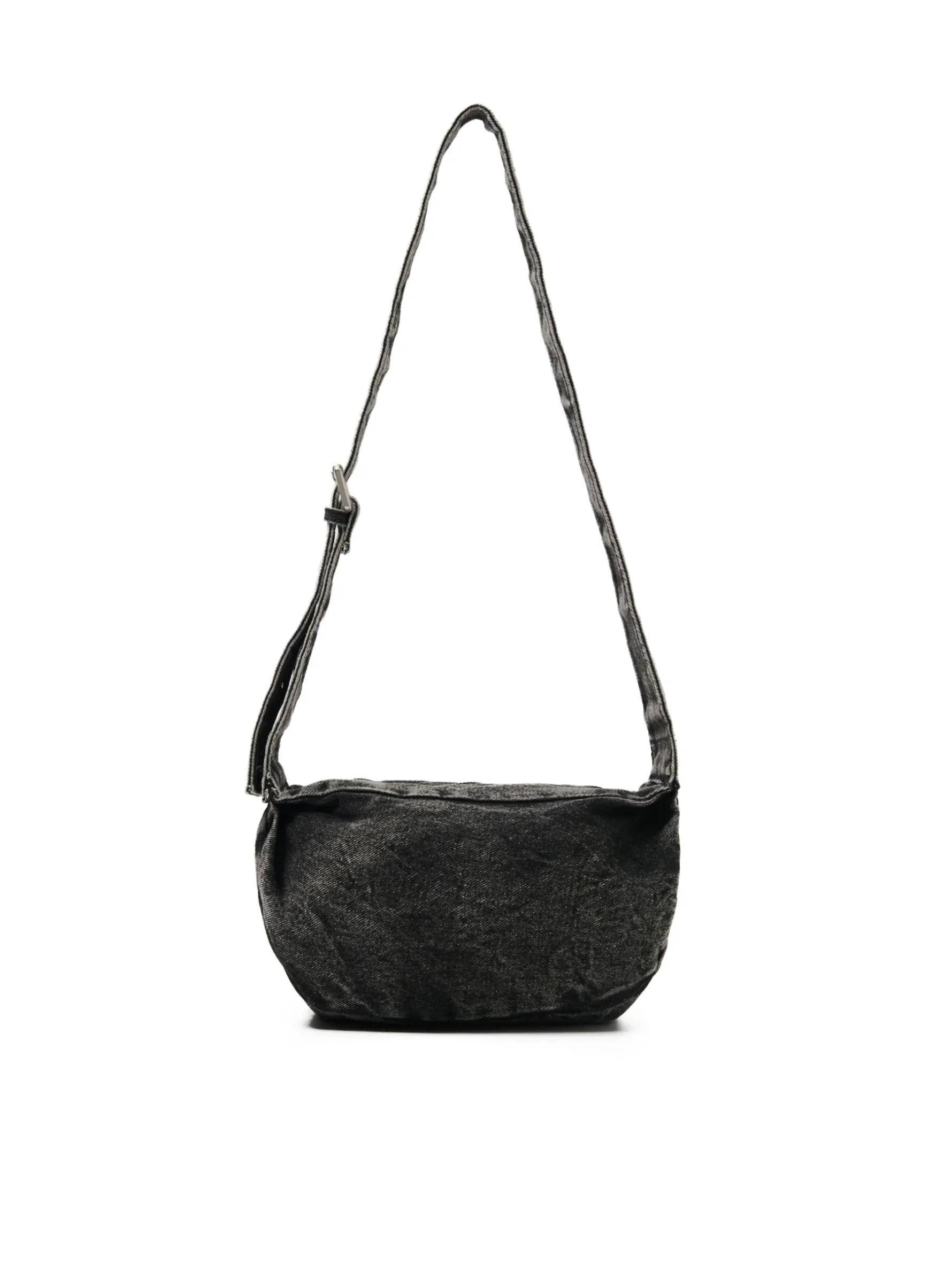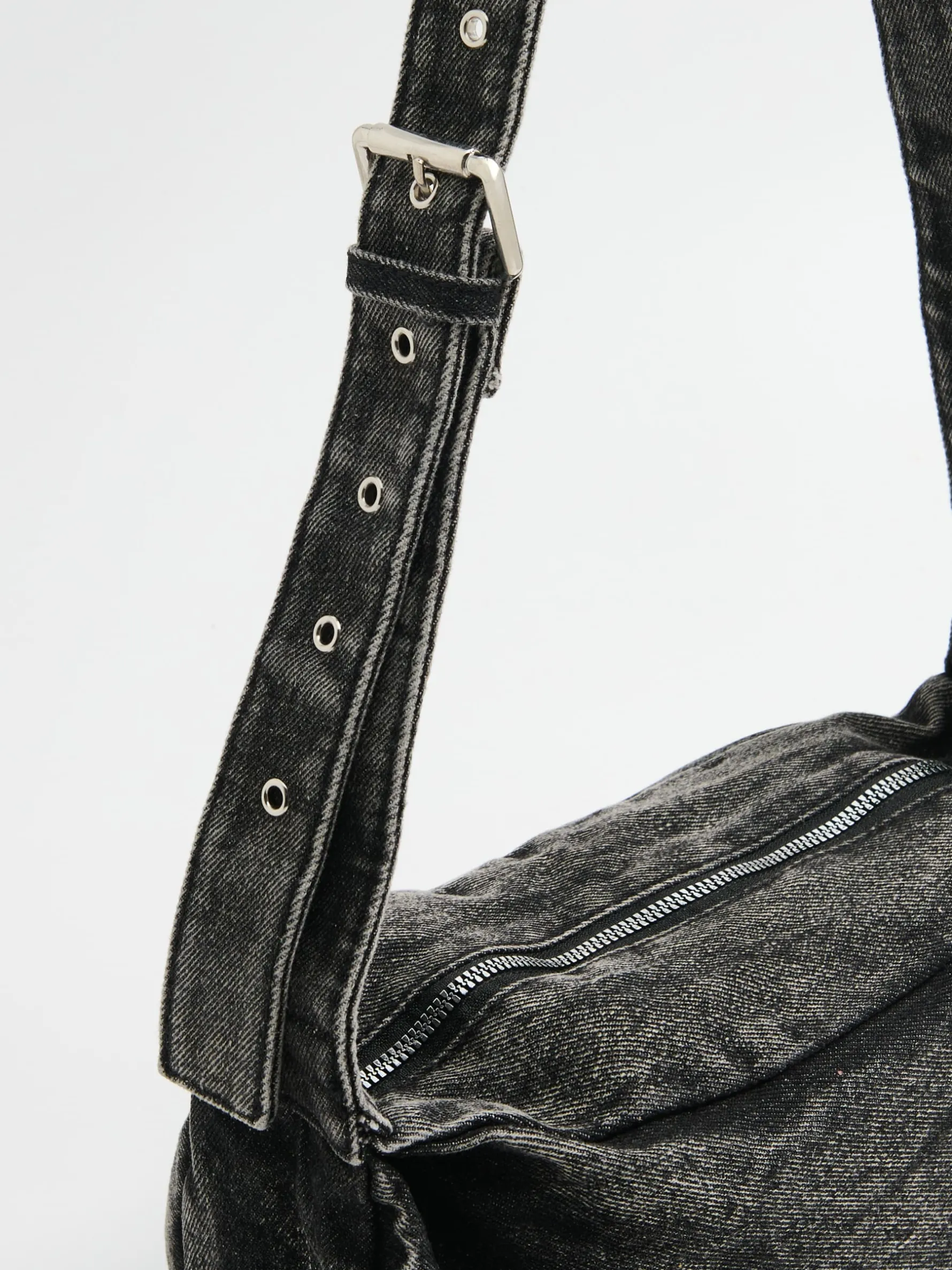 Damska mała torebka wykonana z denimu w szarym kolorze. Ten model wyróżnia wyjątkowy fason i efekt sprania na całej powierzchni. wykonana z łączonych materiałów pasek z regulacją długości główna komora z zapięciem na zamek wewnątrz mała kieszonka z zapięciem na zamek efekt sprania na całości