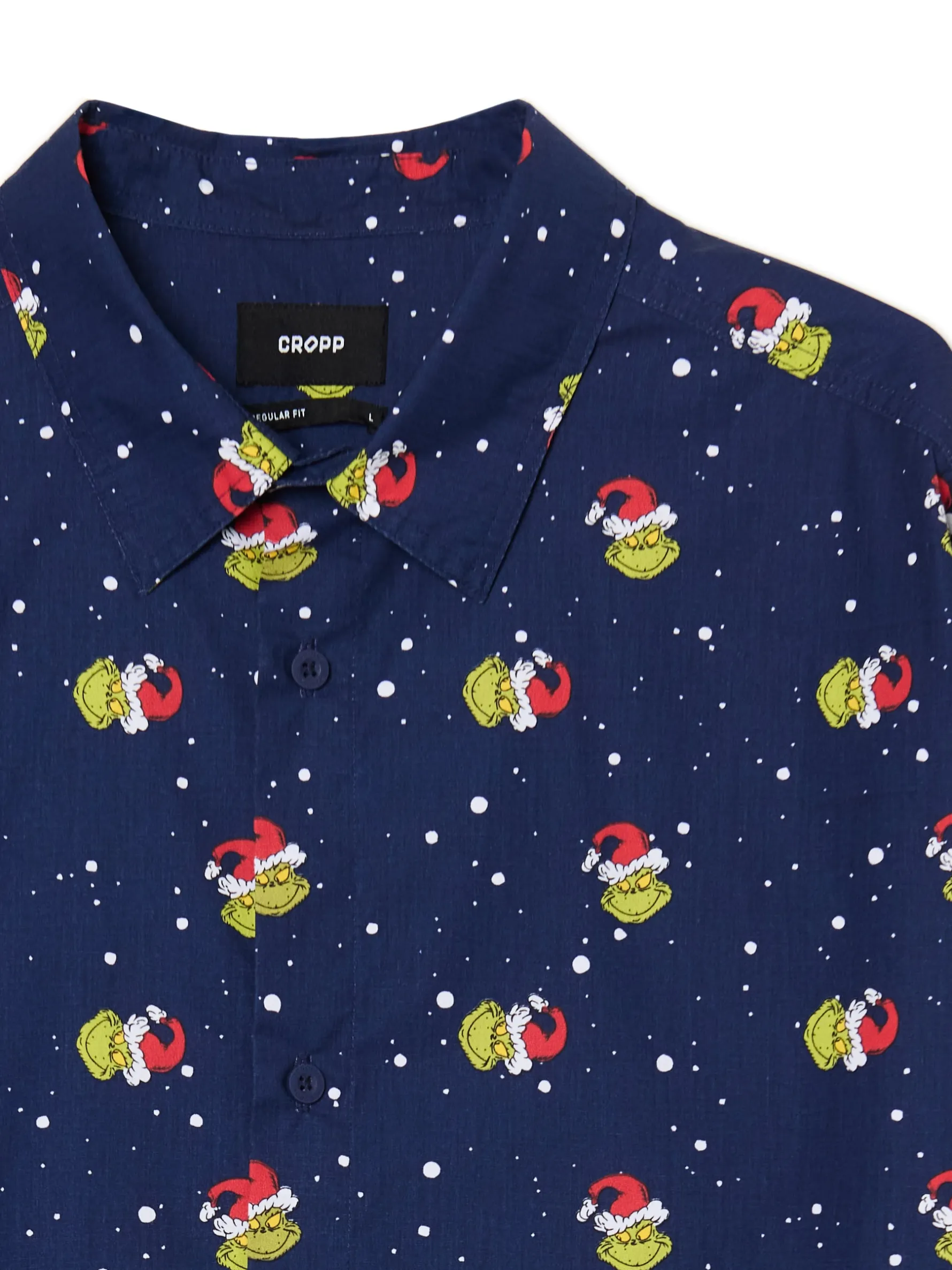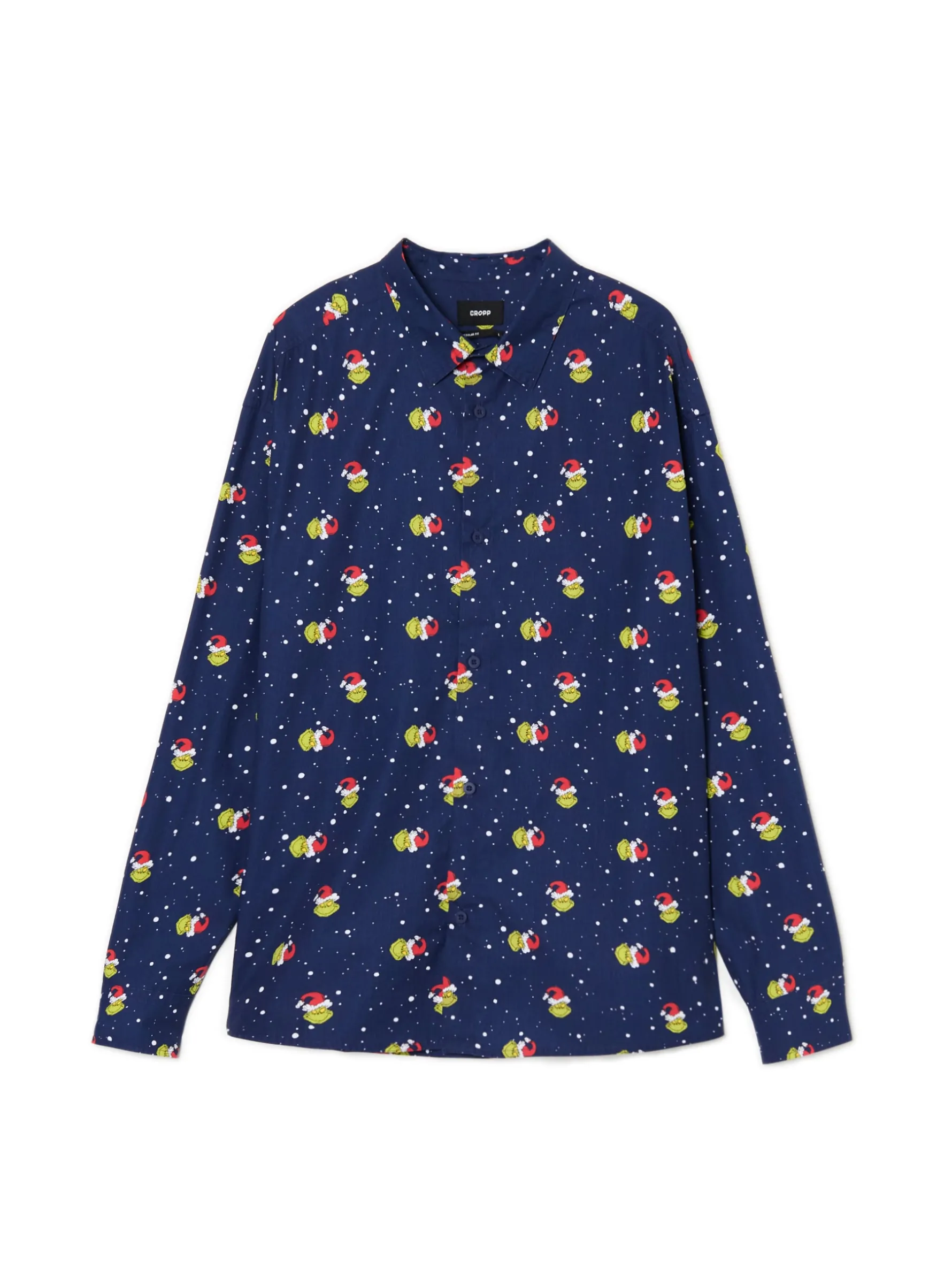 Męska koszula z długimi rękawami, klasycznym kołnierzykiem i praktyczną kieszenią na piersi. Uszyta z przyjemnej w dotyku mieszanki tkanin z dodatkiem bawełny. Na całej powierzchni nadruki z podobizną Grincha. W tym itemie możesz na chillu: podkradać serniczek zjeść wszystkie pierniczki podebrać prezenty spod choinki TM & © 2024 Dr. Seuss Enterprises, L.P. All Rights Reserved