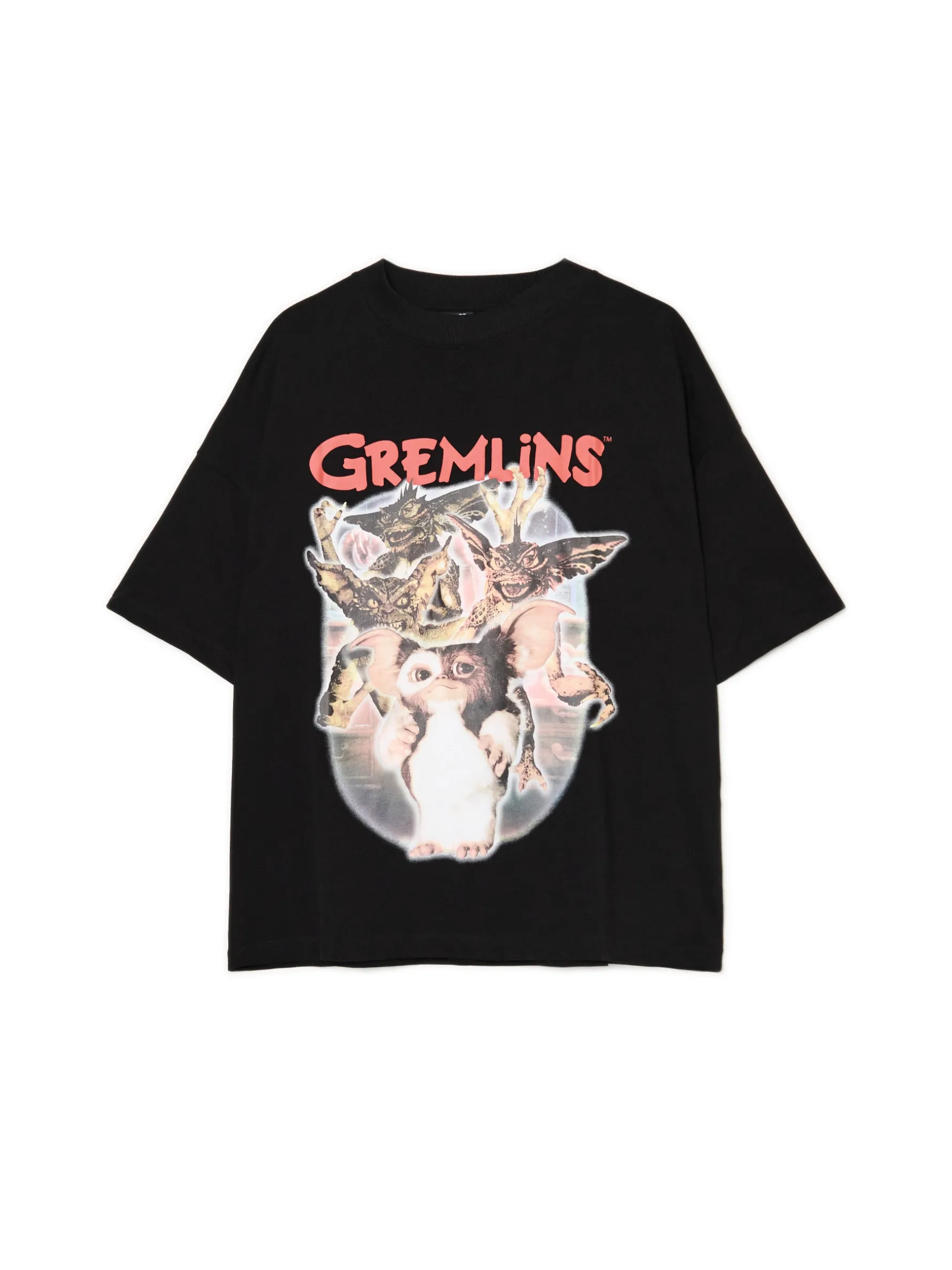 Mamy dla Ciebie bawełniany damski T-shirt w kolorze czarnym z nadrukiem z bohaterami filmu „Gremliny rozrabiają”. Idealny casual na świąteczny czas! 100% bawełny krój oversize okragły dekolt ze ściągaczem krótkie, swobodne rękawy nadruk z motywem filmowym nadruk z motywem Xmas