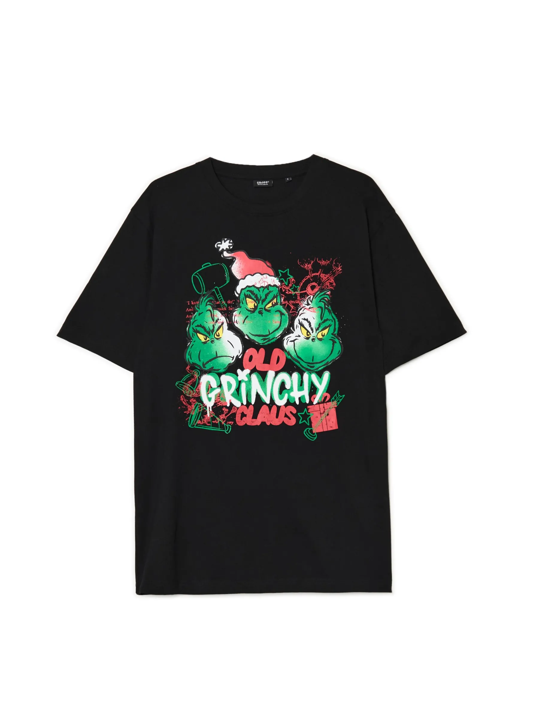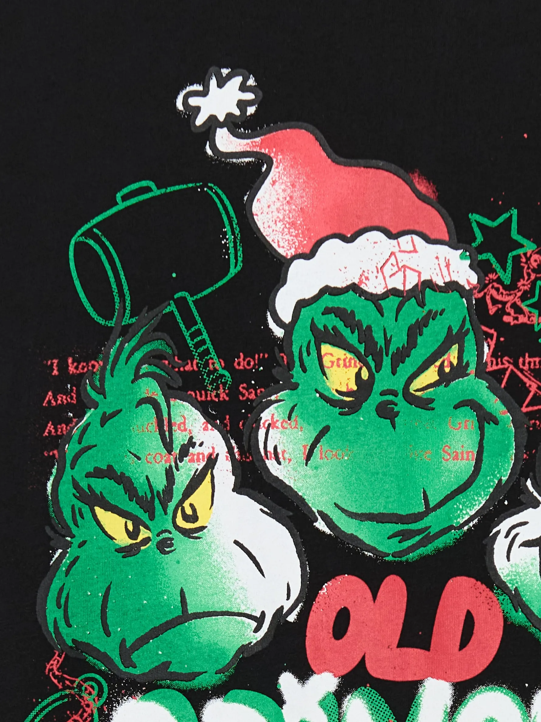 Świąt nie będzie? Na pewno nie bez Grincha! Ta czarna męska bawełniana koszulka z postacią z kultowej serii, pomoże Ci przetrwać te święta. 100% bawełny regularny krój krótkie, swobodne rękawy okrągły dekolt z przodu nadruk Grinch TM & © 2024 Dr. Seuss Enterprises, L.P. All Rights Reserved